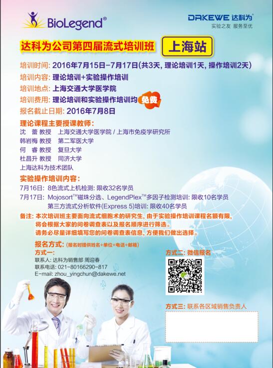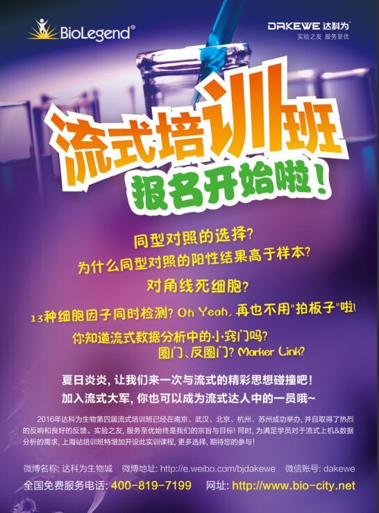2016年達(dá)科為生物第四屆流式培訓(xùn)班已經(jīng)在全國(guó)各地火熱舉辦中,第七站上海培訓(xùn)班經(jīng)過(guò)前期的彩頁(yè)、海報(bào)的宣傳,報(bào)名工作已經(jīng)接近尾聲。目前上機(jī)課程已滿(mǎn),理論課程還有部分名額,感興趣的學(xué)員,歡迎報(bào)名,期待您的參與!