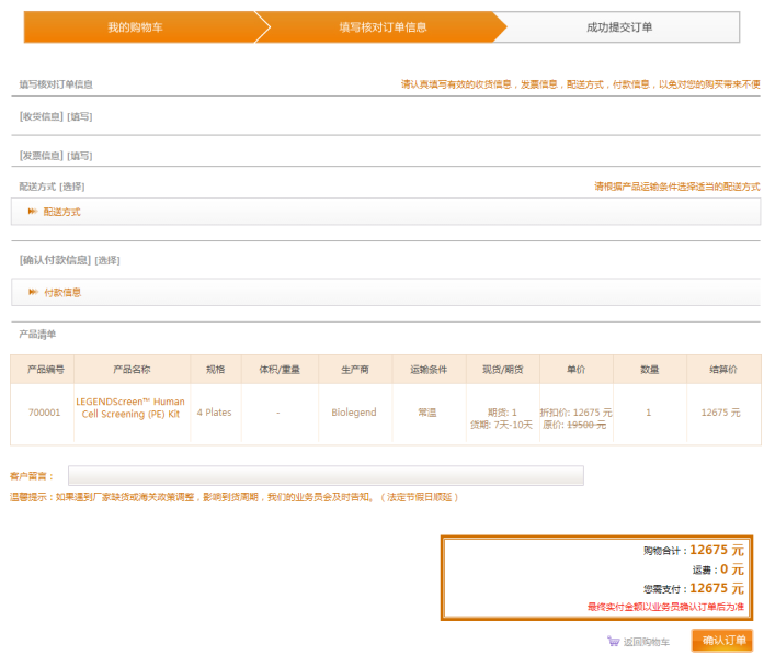 點擊購物車頁面的“結(jié)算”進(jìn)入填寫訂單信息的頁面,在此頁面請認(rèn)真填寫,收貨地址、發(fā)票信息、配送方式、支付方式等信息。點擊“確認(rèn)訂單”即可生成訂單。