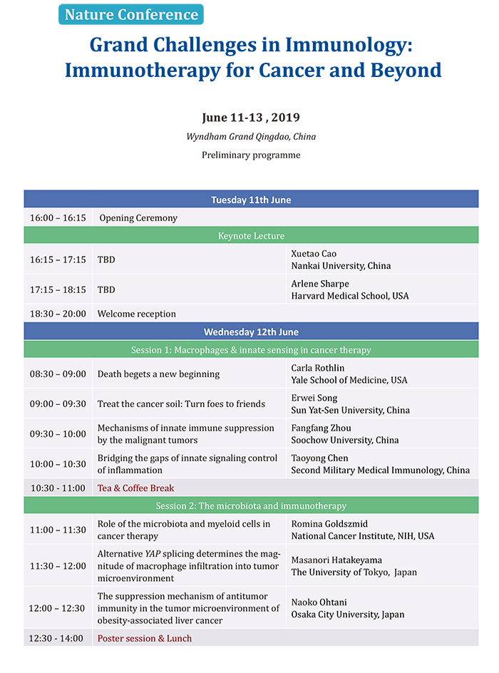 此會(huì)議是以《Nature Immunology》、《Nature Review Immunology》、《Nature》和《Cellular &Molecular Immunology》四本國際頂級(jí)免疫學(xué)期刊為交流平臺(tái),以促進(jìn)國際免疫學(xué)家交流為主旨的學(xué)術(shù)會(huì)議,自2009年起本系列會(huì)議啟動(dòng)召開,現(xiàn)已成功舉辦六屆會(huì)議。