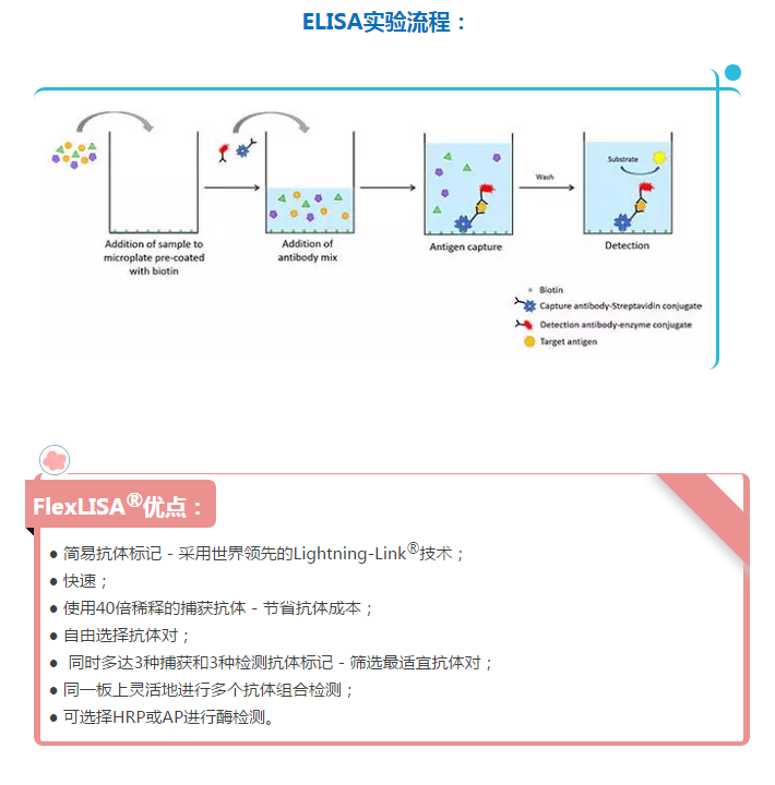 Innova Biosciences FlexLISA?主要是用于開發(fā)和優(yōu)化雙抗體夾心ELISA,將抗體對分別與Streptavidin和HRP/AP標記,然后將樣本和標記抗體對分別加入預(yù)包被Biotin 96孔板,室溫孵育1小時,清洗后加入酶檢測試劑即可實現(xiàn)檢測。