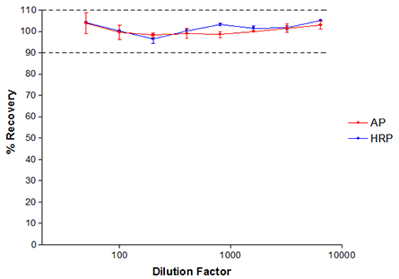 4. 步驟:在鏈酶親和素標記CRP捕獲抗體和HRP/AP標記CRP檢測抗體存在下,耗盡CRP的人血清加到250pg/ml CRP并連續(xù)稀釋后加到透明的96條板狀板中;