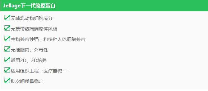 膠原蛋白是一種組成細(xì)胞外基質(zhì)(ECM)關(guān)鍵的蛋白質(zhì),膠原蛋白由三條高度保守的α-螺旋多肽鏈組成。英國(guó)Jellagen提供的下一代Collagen(膠原蛋白)源于水母,兼有Type I和Type II膠原蛋白的活性。良好的膠原蛋白強(qiáng)度和彈性,使其適用于2D和3D細(xì)胞培養(yǎng)、組織工程以及醫(yī)療儀器。Jellagen生產(chǎn)的膠原蛋白由于其低免疫源性和低病原污染性,有著良好的組織兼容性,在創(chuàng)傷修復(fù)和組織工程學(xué)領(lǐng)域有很好的應(yīng)用前景 Why Jellyfish!