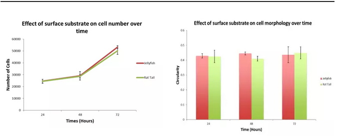 細(xì)胞培養(yǎng)72h結(jié)果顯示,在水母膠原(紅)上生長(zhǎng)的細(xì)胞與在大鼠尾膠原(綠)上生長(zhǎng)的細(xì)胞,細(xì)胞增殖水平和細(xì)胞形態(tài)接近。Jellagen是哺乳動(dòng)物膠原蛋白良好的替代物。