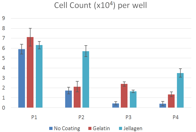 Jellagen膠原蛋白不僅具有良好的細(xì)胞兼容性、細(xì)胞粘附性,還可以為細(xì)胞提供充分的營(yíng)養(yǎng)。在基質(zhì)支持軟骨細(xì)胞生長(zhǎng)過程中,Jellagen膠原上生長(zhǎng)的軟骨細(xì)胞同在牛明膠上生長(zhǎng)的軟骨細(xì)胞比較,細(xì)胞在P4時(shí)存活率更高。