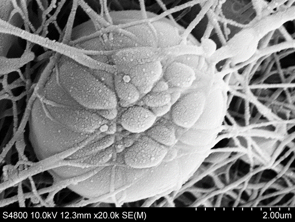 水母膠原蛋白經(jīng)靜電紡絲技術(shù)生產(chǎn)出的納米纖維墊,軟骨細(xì)胞嵌入100nm-200nm纖維叢中。該纖維與天然細(xì)胞外基質(zhì)(ECM)相當(dāng),表明Jellagen膠原蛋白納米纖維提供了細(xì)胞生長(zhǎng)理想的環(huán)境。