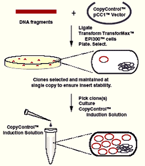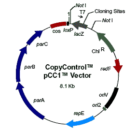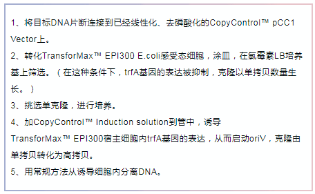 pCC1和pCC2載體含有兩個復制起始位點:單拷貝的大腸桿菌F-因子復制子和誘導型的高拷貝oriV。其中OriV的啟動,需要trfA基因產(chǎn)物,由CopyControl?的另一個重要成分——TransforMax? EPI300 E.coli菌株提供。