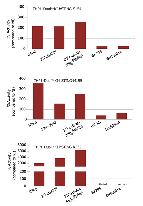 功能獲得(Gain-of-function)的活化-THP1-Dual? KI-hSTING-S154細(xì)胞和THP1-Dual? KI-hSTING-M155細(xì)胞均均可以持續(xù)活化ISG,而THP-1-Dual? KI-hSTING-R232卻不能。加入IFN-β或STING激動劑將進(jìn)一步促進(jìn)ISG的活化。注意,結(jié)果已被非刺激細(xì)胞背景信號標(biāo)準(zhǔn)化。因?yàn)槠涑掷m(xù)活化STING的特性,SAVI細(xì)胞的背景非常高,誘導(dǎo)ISG應(yīng)答的增加倍數(shù)低于R232對照細(xì)胞。