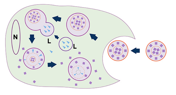 圖. Clophosome?巨噬細(xì)胞耗竭的原理。包裹著氯磷酸的脂質(zhì)體Clophosome?借助巨噬細(xì)胞的內(nèi)吞作用進(jìn)入細(xì)胞,與溶酶體融合后,在磷酸酶的作用下,釋放出氯磷酸,當(dāng)細(xì)胞內(nèi)的氯磷酸濃度達(dá)到一定閾值,就會(huì)對巨噬細(xì)胞造成不可逆轉(zhuǎn)的損害,從而迫使其進(jìn)入細(xì)胞凋亡程序。