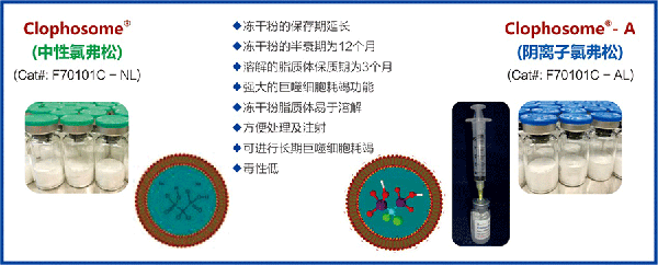 為了延長脂質(zhì)體的保質(zhì)期,廠家已成功推出凍干粉狀的Clophosome?產(chǎn)品,其質(zhì)保期已延長至12個(gè)月。通過簡單的溶解,即可成功獲得氯磷酸鹽脂質(zhì)體。同樣,凍干粉狀的Clophosome?保持了與液態(tài)Clophosome?同樣杰出的巨噬細(xì)胞耗竭功能,以及活性高,使用方便,無菌無毒,以及高濃度,高包封率,不粘稠,無沉淀,易于注射等諸多優(yōu)越性能,尤其是凍干粉狀的Clophosome?克服了脂質(zhì)體保質(zhì)期短,穩(wěn)定性差的缺陷。