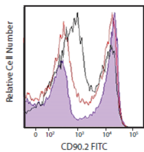 (將小鼠脾臟細(xì)胞分別用TruStainFcX TM PLUS(0.25μg/test,紫色填充直方圖),TruStainFcX TM(克隆93,1μg/test,紅線)封閉之后用CD90.2FITC染色,與未處理的小鼠脾臟細(xì)胞(黑線)作比較。結(jié)果顯示TruStainFcXTM PLUS封閉效果更優(yōu)。)