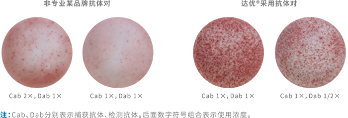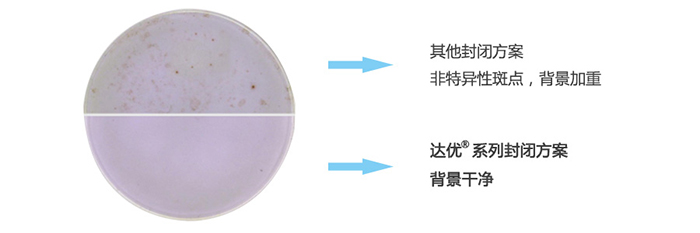 不同的檢測樣本在板孔培養(yǎng)過程中,受各種實驗條件影響,如果封閉不當(dāng)都可能產(chǎn)生非特異性顯色,導(dǎo)致非特異性斑點的產(chǎn)生或者背景顏色的加重。這將直接影響到最后結(jié)果的判斷分析。達(dá)優(yōu)?系列產(chǎn)品通過大量實驗,對不同來源、不同配方封閉方法進(jìn)行封閉效果的對比試驗,篩選出更高效的封閉系統(tǒng),并將之運用到系列試劑盒產(chǎn)品中。