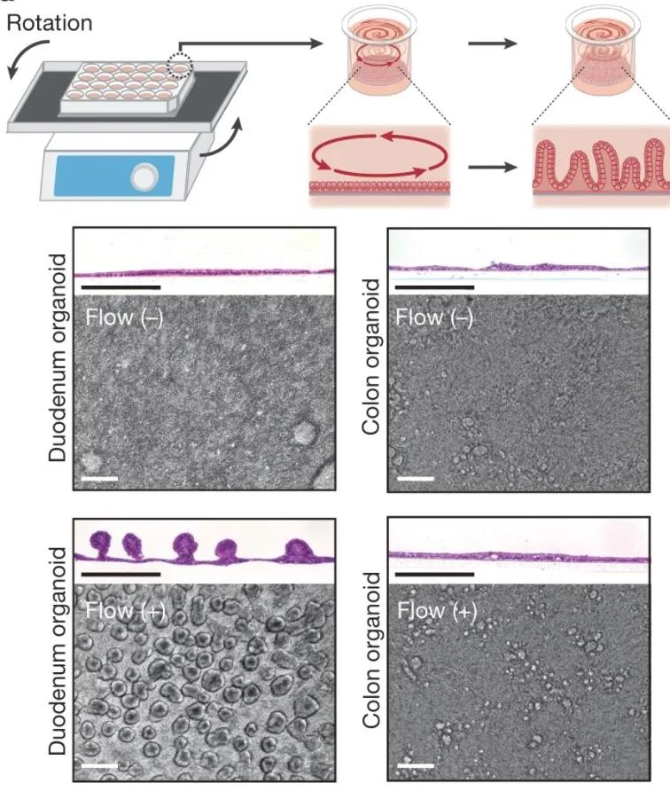 下圖為存在(+)或不存在(-)流動(dòng)的培養(yǎng)基的情況下培養(yǎng)四天的2D十二指腸和結(jié)腸類器官的鏡下圖片。(蘇木精和曙紅染色)