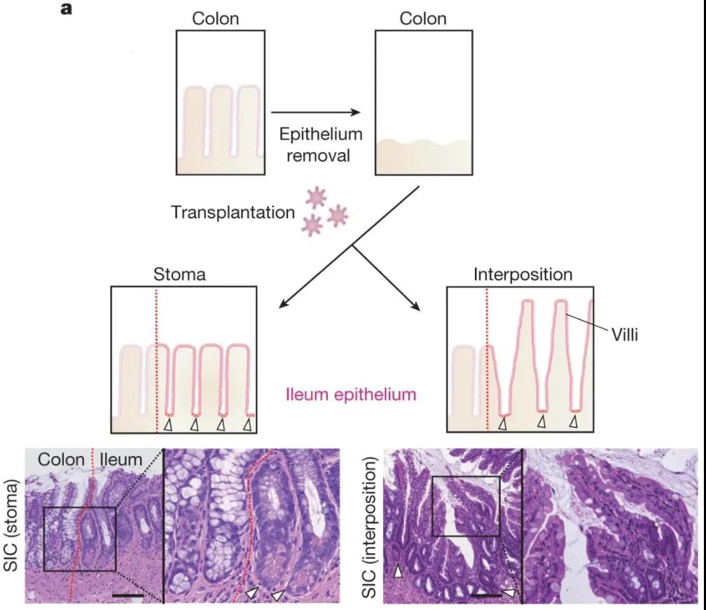 通過上皮置換產(chǎn)生SIC的策略。頂部,結(jié)腸上皮被去除(EDTA處理),然后回腸類器官被移植。在進(jìn)行介入手術(shù)之前,移植的回腸上皮顯示出隱窩狀結(jié)構(gòu)(左下圖和圖像)。移植后,會(huì)形成絨毛狀結(jié)構(gòu)(右下圖和圖像)。白色箭頭表示潘氏細(xì)胞。