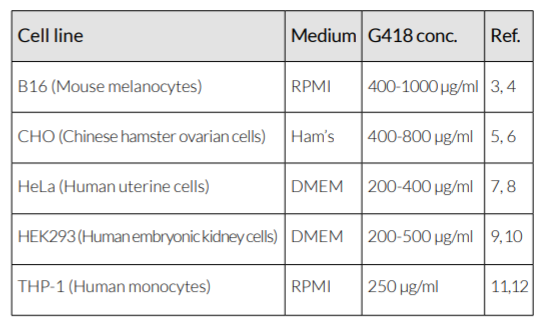 InvivoGen建議的工作濃度:G418通常以400 μg/ ml的濃度使用。當(dāng)然仍需要為您的細(xì)胞確定最佳濃度。下面列出了常見哺乳動物細(xì)胞使用G418篩選的濃度(參見下表)。