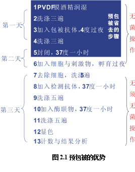 如圖2.1所示,預(yù)包被有著明顯的技術(shù)優(yōu)勢(shì)。PVDF板的ELISPOT試驗(yàn)一共需要3天時(shí)間,采用預(yù)包被板可以節(jié)省一天的時(shí)間,當(dāng)天處理細(xì)胞,當(dāng)天上板檢測(cè);未包被的檢測(cè)共有13步,預(yù)包被可以省掉其中的5步,并且這5部都是需要無菌操作的步驟,占整個(gè)無菌操作步驟的5/6。節(jié)省時(shí)間只是其一,由于減少了無菌操作的步驟,使得整個(gè)實(shí)驗(yàn)污染與出錯(cuò)的概率大大降低,提高了整體試驗(yàn)的成功率。