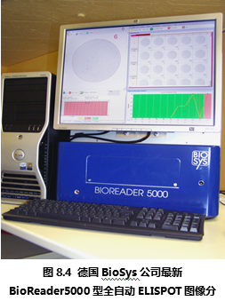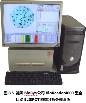 德國Bio-Sys公司從上世紀(jì)80年代開始就致力于生物圖像識別領(lǐng)域,在進(jìn)入ELISPOT圖像分析儀市場后一直以其先進(jìn)的ELISPOT斑點識別技術(shù)聞名。德國Bio-Sys公司首先解決了顯微攝像系統(tǒng)難以定位96孔板上的每一個孔的問題。其解決方法基于圖像識別技術(shù),利用板孔邊壁和真正的孔底的細(xì)微差別,在機械定位的基礎(chǔ)上,通過軟件識別來進(jìn)一步提高每孔的定位精度。是目前市場上所有ELISPOT圖像分析儀中唯一能夠完整識別整個孔底ELISPOT斑點圖像的設(shè)備。在對真假斑點的分辨中,德國Bio-Sys公司除了具備完善的物理學(xué)多參數(shù)識別技術(shù),還特別針對ELISPOT斑點形成的生物學(xué)過程,通過細(xì)胞因子顯色后的“光密度”峰值積分分析方法,精確分辨真假斑點、融合斑點等復(fù)雜情況。Bioreader系列ELISPOT圖像分析儀國外大多數(shù)較有經(jīng)驗的ELISPOT實驗室推崇的特點為:專業(yè)性和參數(shù)全開放性。因為ELISPOT實驗的復(fù)雜性,ELISPOT斑點形成在不同的實驗條件下有非常大的差異。這就對ELISPOT圖像分析儀提出了較高的要求:既要能夠保證斑點計數(shù)的真實性和一致性,又要能夠根據(jù)不同情況,通過實驗者的判斷來校正儀器對ELISPOT斑點識別的標(biāo)準(zhǔn)。要同時實現(xiàn)以上兩個要求,唯一的辦法是將儀器的所有判斷標(biāo)準(zhǔn)向ELISPOT實驗者開放,實現(xiàn)實驗者和儀器的互動。在這一方面,德國Bio-Sys公司始終走在ELISPOT斑點識別領(lǐng)域的前列,新的Bioreader-4000型(圖8.3)和Bioreader -5000(圖8.4) 型在專業(yè)性和適用性方面都領(lǐng)先于其他廠家的設(shè)備。