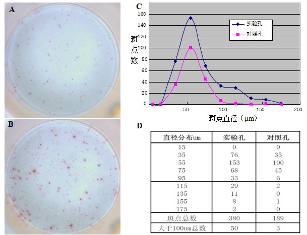 由于有了充足的信息與理由,我們可以在最后斑點計數(shù)的時候,把斑點直徑的閾值設(shè)定為100μm:我們只計數(shù)大于100μm的斑點,小于100μm的斑點不予計數(shù)。這樣負對照孔與實驗孔的最終結(jié)果為3:50,相差有17倍!這比最初相差一倍的結(jié)果顯著得多。