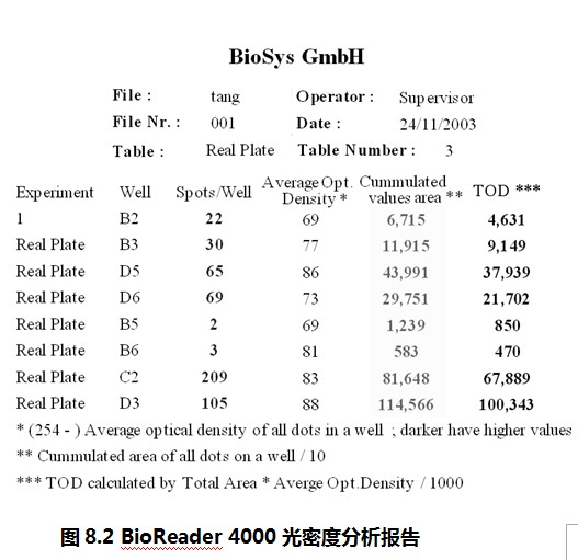 如圖8.2所示,這是BioReader 4000光密度分析報告。它可以提供的信息有:孔的位置、每孔的斑點數(shù)目、該孔斑點的平均光密度(Average Opt. Density)、該孔斑點的總面積(Cumulated values area)、該孔相對細胞因子分泌總量(TOD,即光密度總值)。