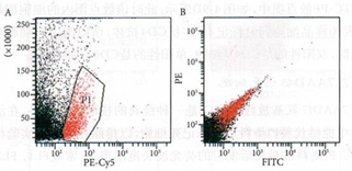 PE-Cy5通道(通常是FL3,接收的熒光波長范圍大致為655-685nm)有時可用于識別死細胞,但首先該通道必須是閑置的通道,及樣本細胞中沒有標記該通道代表的熒光素(PE-Cy5、PerCP等)偶聯(lián)抗體。選擇PE-Cy5-SSC散點圖,一般可看到不成群的PE-Cy5陽性細胞,這些陽性細胞的SSC值也是散在分布的,這些散在的PE-Cy5通道非標記陽性細胞,即圖2-A中的紅色部分,將這部分細胞設門顯示于FITC-PE散點圖中,如圖2-B所示,這部分PE-Cy5通道非標記陽性細胞基本都位于對角線部分,而對角線細胞一般為死細胞,所以散在的PE-Cy5通道非標記陽性細胞一般就是死細胞。