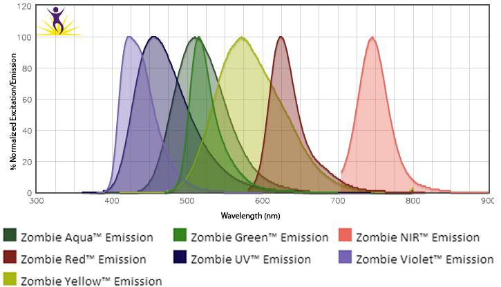 Zombie Dyes有別于PI和7-AAD等DNA染料,它是一種可用于需固定細胞實驗的染料,通過與細胞上蛋白質(zhì)的氨基結(jié)合來實現(xiàn)。因活細胞可排除染料,所以僅細胞膜被著色;而死細胞的細胞膜及細胞質(zhì)均被著色,繼而根據(jù)熒光信號的強弱來區(qū)分死/活細胞。而且Zombie Dyes可選擇性多,可以由不同的激發(fā)光激發(fā),便于靈活選擇。