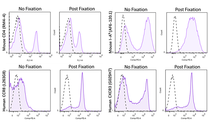流式實(shí)驗(yàn)中,有一些情況我們希望或需要對樣本進(jìn)行預(yù)先固定處理,比如前文說過的傳染病人的樣本或者是需要檢測蛋白翻譯后修飾的樣本。對于需要預(yù)固定的樣本,首先需要考慮預(yù)先固定處理對檢測指標(biāo)的影響,有很多指標(biāo)先染色再固定和先固定再染色出來結(jié)果差異非常大,導(dǎo)致這些差異原因和指標(biāo)的類型、抗體的克隆號(hào)等因素都有關(guān)系。