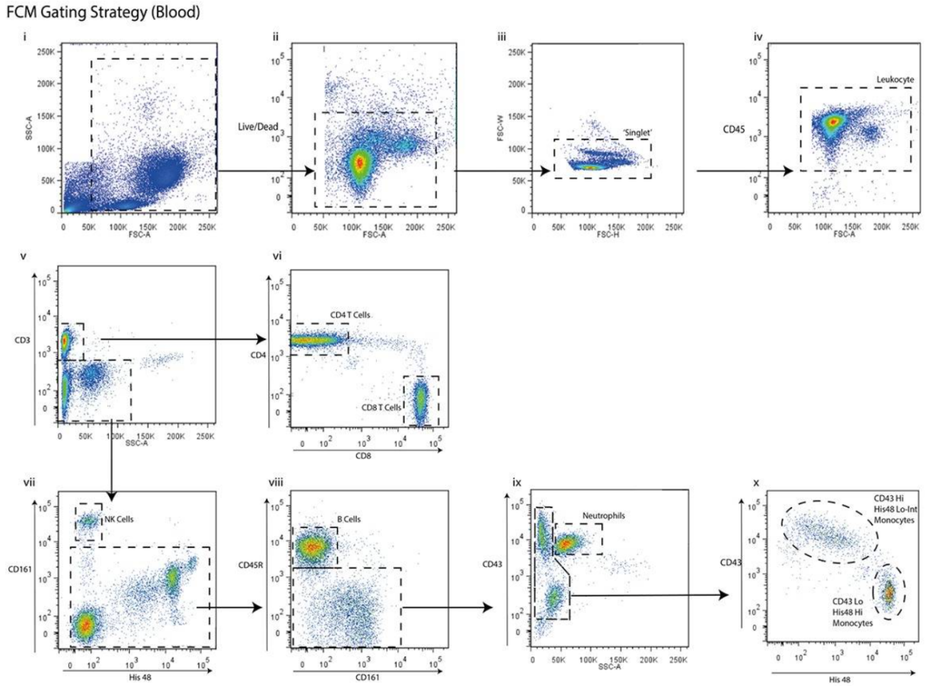 5. 中性粒細(xì)胞:從CD45+CD3-CD161-CD45R-的細(xì)胞中,圈出CD43+細(xì)胞(ix);