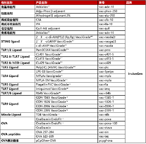 當前,針對COVID-19的疫苗研發(fā)以前所未有的速度在世界范圍內陸續(xù)開展,世界各地的科學家正在探索開發(fā)針對SARS-CoV-2的有效疫苗的所有潛在策略。大多數(shù)用于COVID-19的候選疫苗旨在誘導針對病毒S蛋白的中和抗體,防止病毒通過人ACE2受體攝取從而阻止感染。COVID-19疫苗開發(fā)前景的顯著特征是正在評估的技術平臺的多樣性,包括:減毒活疫苗,基于病毒載體的疫苗,基于重組蛋白的疫苗,DNA疫苗和RNA疫苗。其中重組蛋白疫苗通常使用SARS-CoV-2蛋白(例如S蛋白)在宿主中引起免疫反應。通常與佐劑結合使用以提高免疫原性。迄今為止,已進入臨床試驗的COVID-19候選疫苗包括Moderna開發(fā)的mRNA疫苗(NCT04283461)和康希諾 (NCT04341389)開發(fā)的重組腺病毒疫苗。此外,諸如AS03和MF59等佐劑正在重組蛋白疫苗中進行探索,使用佐劑可增強免疫原性并降低劑量,使更多人接種疫苗成為可能。天然免疫專家InvivoGen提供科研用途的佐劑和OVA產(chǎn)品供研究人員選擇。